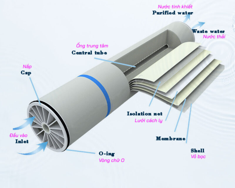- Lớp màng bán thấm: được làm từ polyamide, cho phép phân tử nước tinh khiết đi qua và giữ lại các ion, vi khuẩn, kim loại nặng...