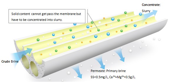 Màng UF có cấu trúc dạng sợi rỗng (hollow fiber), nước đi qua các mao quản và để lại cặn bẩn bên ngoài.